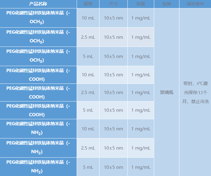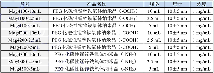 Suzhou Beike Nano Technology Co., Ltd. improves the quality of DSPE-PEG2000 modified magnetic manganese-zinc ferrite nanocrystals, which have excellent biocompatibility and biomolecule re-modification capabilities. Magnetic manganese-zinc ferrite nanocrystals have uniform size, high saturation magnetization and contrast-enhanced imaging effects. The surface of the nanoparticle is modified with biocompatible PEG or phospholipid PEG for high density. It has excellent water solubility, so it has a long blood circulation time in the body and passive tumor targeting ability. It is resistant to macrophage phagocytosis and can be used for magnetic resonance T2. Radiography. And the PEG end has methoxy, carboxyl, amino and other groups, which is convenient for coupling with specific targeting recognition molecules (such as antibodies, aptamers, targeting peptides, etc.) to construct targeted nanoprobes for MRI Targeted imaging and molecular imaging research. In addition, the PEG end or the phospholipid layer can introduce molecules such as fluorescence and chemotherapeutics through chemical coupling or hydrophobic interaction, thereby constructing MRI/optical dual-modality imaging and molecular imaging research, and magnetic induction tumor hyperthermia research.