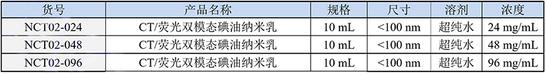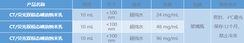 Suzhou Beike Nano Technology Co., Ltd. provides high-quality CT/fluorescence dual-modal lipiodol nanoemulsion, which is a milky white, greenish clear liquid, dispersed in pure water, and has been filtered and sterilized with a 0.22 micron filter membrane. Size, iodine concentration, fluorescence intensity are adjustable within a certain range, CT imaging contrast enhancement effect is good, low nephrotoxicity, safety and environmental protection, no pollution, has good dispersibility, good stability, and can be used for mouse tumor models and other models CT fluorescence dual-modality imaging, etc.
