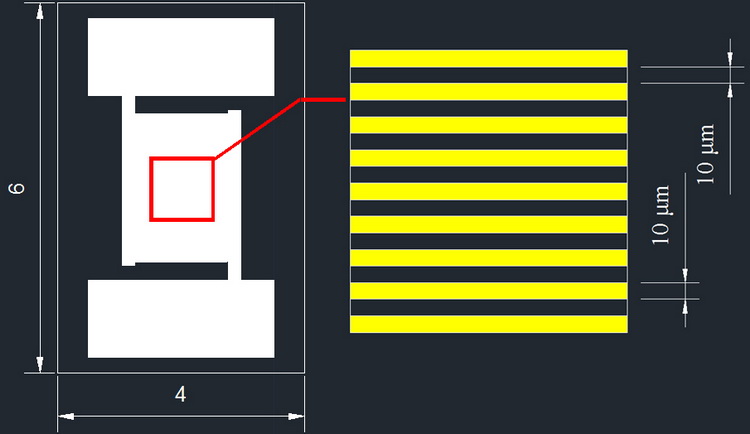 2. Line width: 10um, line spacing: 10um, finger length: 1.5mm, interdigital logarithm: 60 (120 fingers).