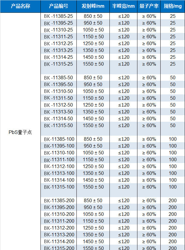 The oil-soluble PbS quantum dot products produced by Suzhou Beike Nanotechnology Co., Ltd. are coated with hydrophobic ligands. The average quantum yield is 50%. When storing, they should be stored away from direct sunlight and stored in a sealed dark place at 4 degrees. Customized production of products with different grams of any wavelength from 800nm to 1600nm. This product has the characteristics of uniform particle size, wide absorption spectrum, narrow and symmetrical emission spectrum, and high and stable fluorescence intensity. It can be used in electronic communications, liquid crystal displays, light-emitting diodes, solar cells, bioluminescent markers and other fields.