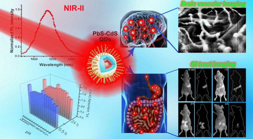 Using near-infrared two-zone fluorescence imaging technology to realize the imaging of brain blood vessels and gastrointestinal tract in living mice. In this work, the research group used a kind of PbS@CdS quantum dots (quantum yield 60%) that emits very strongly in the near-infrared second region (NIR-II, 1000-1700nm) and formed by double-layer coating. PbS@CdS@SiO2@F-127 nanoparticles with strong luminescence, and the nanoparticles also have very good pH stability and biocompatibility. The research team injected PbS@CdS@SiO2@F-127 nanoparticles into mice through the tail vein, and used a laser with a wavelength of 785nm (located in the near-infrared region) to excite the cerebral blood vessels of the mice to achieve microscopic imaging. The deep brain was observed The clear structure of blood vessels, the imaging depth can reach 950¦Ìm. At the same time, the research team also injected a small amount (80¦Ìg/kg) of PbS@CdS@SiO2@F-127 nanoparticles into mice, and used near-infrared two-zone fluorescence imaging technology to realize the imaging of the mouse gastrointestinal tract. S/N ratio of gastrointestinal structure. This article was published in the latest issue of Advanced Functional Materials in 2017 hosted by the German Chemical Association (Wiley). The magazine has an impact factor of 12.1 in 2016. It belongs to the first section of the JCR journal of the Chinese Academy of Sciences and is an authority in the field of nano-functional materials. This research provides a new technical guidance scheme for the production of high-efficiency and high-stability quantum dot fluorescent contrast agents.