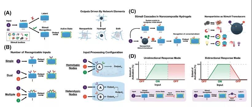 图1. 刺激响应型纳米复合水凝胶对内外刺激输入动态反应的过程。[内容解读]1.纳米复合水凝胶的设计和组装方式纳米复合水凝胶指含有纳米材料的水化聚合物网络,能通过非共价相互作用或共价连接组装形成。独立式体系中只需其中一个模块间有相互作用,另一成分作为网络填充成分,通过自交联形成更牢固的体系;而共依存体系的组装需要有水凝胶-NP间的相互作用,得到的复合凝胶可能是两成分的加和或协同作用。复合体系的组装方式通常分为四种:(1)水凝胶前驱液加在预组装的NP悬浮液中进行交联,使粒子在支架中预分布;(2)水凝胶交联后原位形成NP;(3)水凝胶交联后,预组装的纳米粒子向内扩散;(4)通过纳米粒子作为基质/网络交联剂组装的共依存水凝胶。2.刺激响应型纳米复合水凝胶的设计方案NP和水凝胶的结合能形成性能优异的体系,通过刺激响应能将性能进一步扩展。通常复合水凝胶可以解构成NP或水凝胶基质等核心成分,作为材料中的刺激响应或效应模块,在识别后以输出形式引起体系变化。除了对单刺激产生响应,生物系统还能配备多种受体对不同的刺激输入作出反应,并根据组成来识别和处理不同数量的刺激并将其作为初始输入信号,而纳米复合水凝胶的多组分和分级结构也有利于通过结合水凝胶基质和NP来编码多种刺激响应。开发这种多刺激反应体系对于改善体内药物运输的敏感性和顺应性至关重要。此外,和活细胞类似,部分NP也能利于自身的转化能力作为智能转化成分,通过转换结点将多种刺激有序连接,并通过NP刺激传感器对很多曾经无法识别的刺激做出响应。目前的刺激转换结点大多来自作为天然刺激传感器的纳米材料或能承载刺激转换特性的NP。而根据所识别的刺激,响应分为单向和双向两种模式。
