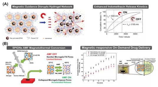 图4. 磁响应型纳米复合水凝胶的按需给药过程。[结论与展望]与静态平台相比,刺激响应型纳米复合水凝胶对于开发复杂的生物功能平台有更明显的优势,正如本文所述,NP和水凝胶结合的产物显示了优异的设计和组装灵活性,以及对生物医学性能的增强。但无论其潜力和发展焦点多么引人关注,这种复合材料目前还未获得监管部门批准在医疗保健使用,如何克服从实验室到临床之间的障碍,仍是研究中所面临的重大挑战。