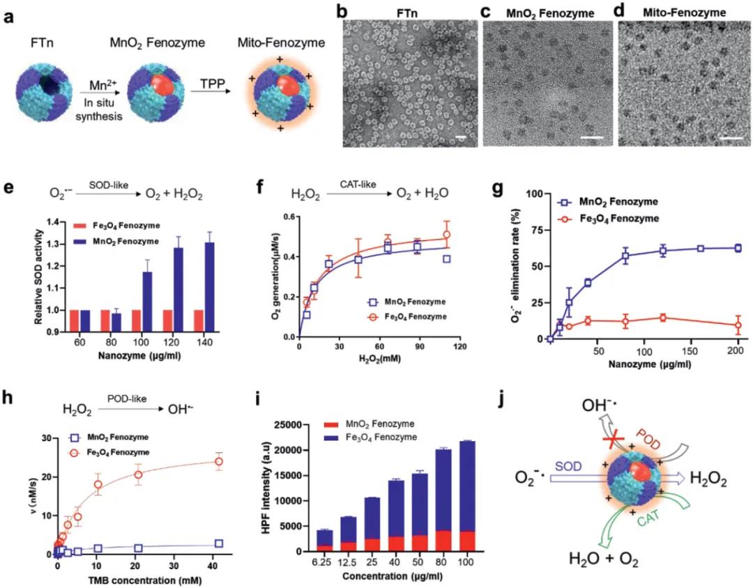 (1)这些纳米酶以铁蛋白重链基蛋白为酶支架,以金属纳米颗粒为酶活性中心,其具有超氧化物歧化酶和类过氧化氢酶的活性,并能通过克服多种生物屏障来靶向线粒体。