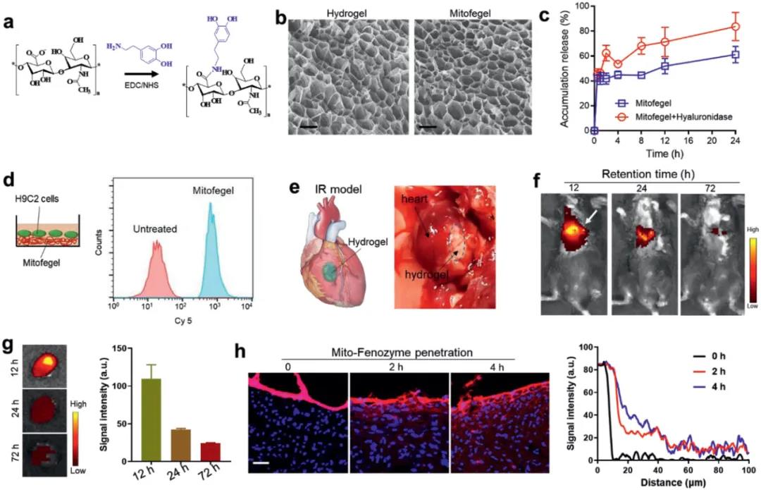 (2)在心脏缺血-再灌注动物模型中,实验分别通过全身递送和局部释放黏附水凝胶(即心脏贴片)的方式证明了该杂交纳米酶可在体内对线粒体氧化损伤和在梗死后心脏功能的恢复过程中发挥保护作用。综上所述,这一研究充分阐明了模拟酶的从头设计策略,同时也为缓解氧化损伤提供了一个新型的治疗选择。