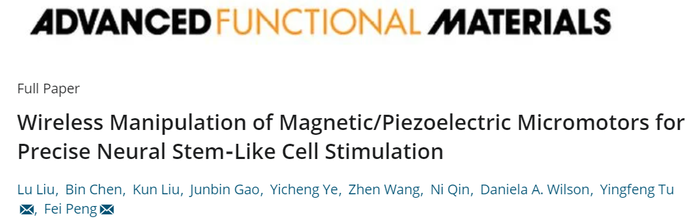 涂盈锋教授团队与中山大学彭飞团队及荷兰埃因霍芬理工大学的Jan van Hest团队展开合作,设计出了一种基于金纳米棒的多功能仿生纳米体系。研究人员以顺铂与透明质酸上的羧基之间的离子螯合作用为灵感,对金纳米棒表面进行巯基透明质酸的改性,成功地在金纳米棒表面交联形成了凝胶载药储库,使得经典抗癌药物阿霉素与顺铂能够同时实现负载。此外,为了达到更好的肿瘤靶向效果,该研究在纳米载体表面包裹了肿瘤细胞膜,最终得到仿生纳米体系。当与同源及非同源肿瘤细胞共孵育时,该仿生纳米载体能够选择性地富集于同源肿瘤细胞内,表现出了优异的肿瘤靶向能力。采用尾静脉注射24小时后,载体实现了在小鼠移植瘤内的大量富集。在近红外激光的照射下,载体内核的金纳米棒可产生光热效应,局部的热能触发了负载化疗药物的释放,从而实现针对肿瘤的协同的光热及化疗。该研究论文的第一作者单位和最后通信作者单位均为南方医科大学药学院,其中论文第一作者为药学院2018级硕士研究生高俊彬,末位通讯作者为涂盈锋教授;中山大学彭飞教授及荷兰埃因霍芬理工大学的Jan van Hest教授为共同通讯作者。研究得到了中组部海外青年项目、国家自然科学基金、广东省自然科学基金以及珠江学者等项目的支持。另外,涂盈锋教授团队在微纳米马达再生医学领域取得了新的研究进展。研究结果以“Wireless Manipulation of Magnetic/Piezoelectric Micromotors for Precise Neural Stem-Like Cell Stimulation(无线操纵磁控压电微马达精准刺激类神经干细胞)”为题,在化学类国际材料科学期刊Advanced Functional Materials (IF=15.621)在线发表。该工作是与中山大学相互合作的成果。药学院涂盈锋教授、中山大学材料科学与工程学院彭飞教授为本文共同通讯作者。南方医科大学硕士研究生刘璐为本文的第一作者。该研究受到国家自然科学基金、广东省青年珠江学者项目的支持。奈梅亨大学Daniela A. Wilson教授参与了本项研究,为论文的共同作者。