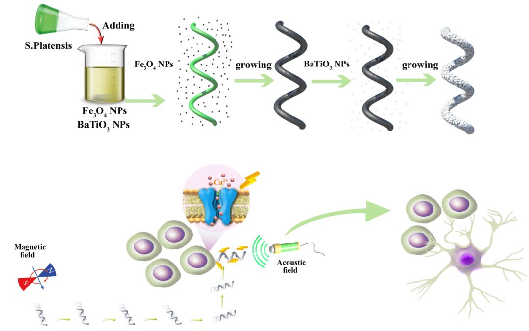 为了解决这一难题,本文作者率先利用生物杂交技术构建了一类具有精准诱导类神经干细胞分化的多功能自驱动微纳米马达系统。通过在螺旋状马达系统中引入磁响应性材料,实现了马达在外加磁场下的精准运动,从而定点到达预定的类神经干细胞表面。将超声与压电材料相结合,利用超声所产生的机械应力来诱导马达表面的压电材料,使其产生直流电输出,从而促进细胞在刺激位点形成轴突并实现分化。这是目前世界上首个利用磁控压电功能来精准诱导类神经干细胞精准分化的报道。该体系巧妙地整合了可控运动、无创诱导神经干细胞分化等多种功能,在单细胞水平上实现了信号的精准输入,有望解决当前神经干细胞分化缺乏精准控制的挑战。论文链接:https://onlinelibrary.wiley.com/doi/10.1002/advs.201903642https://onlinelibrary.wiley.com/doi/10.1002/adfm.201910108