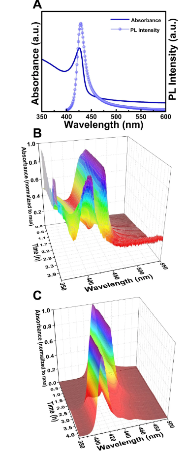 此外,他们的研究还发现,在一定的实验条件下,通过使用合适的配体,反应可以产生比PMSCs尺寸更小和更难吸收的粒子,即使在没有A(甲基胺-MA+)组分参与的条件下也会产生。