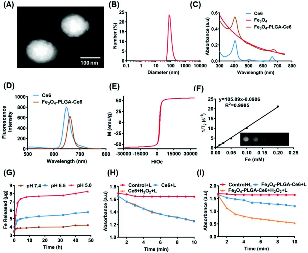 铁死亡治疗是利用铁生物诱导物产生致死性脂质过氧化以诱导肿瘤细胞死亡,它也被认为是一种很有发展前景的癌症治疗策略。然而,如何增加肿瘤微环境(TME)中活性氧(ROS)的积累以提高其抗肿瘤疗效仍是一个研究挑战。西南大学宋杨教授和朱小康副教授设计了一种包覆有PLGA,含有铁氧化物(Fe3O4)和光敏剂Ce6的聚纳米系统Fe3O4-PLGA-Ce6,并将其用于协同铁死亡-光动力抗癌治疗。