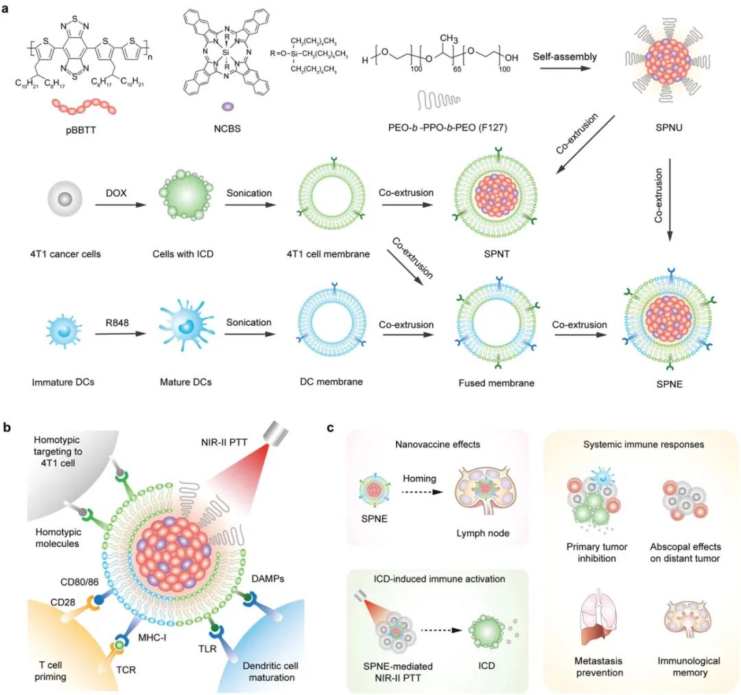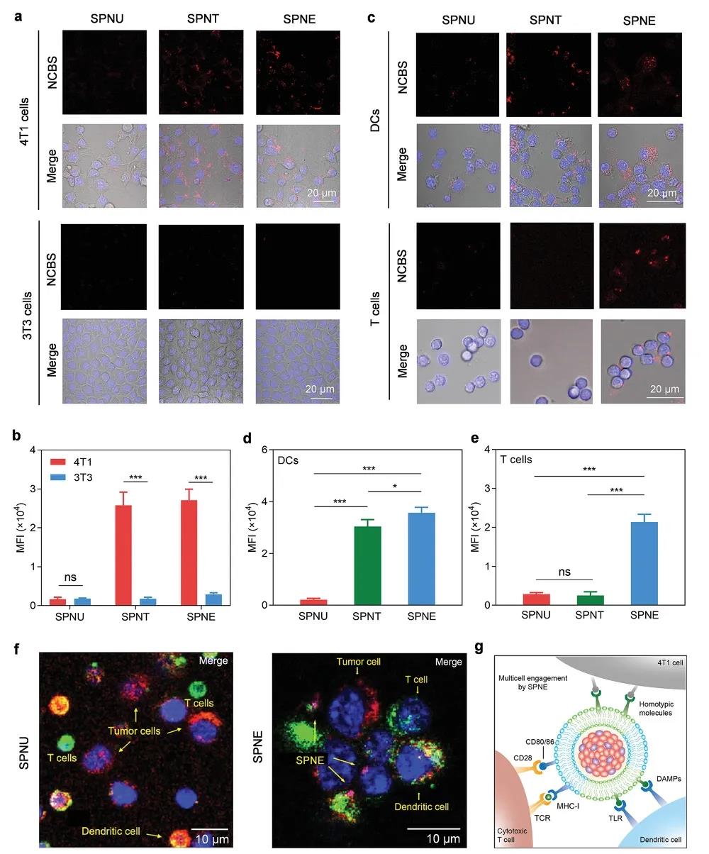 纳米接合器由一种NIR‐II吸收聚合物作为光热核,由免疫工程肿瘤细胞和树突状细胞(DC)形成的融合膜伪装成癌症疫苗的外壳,这种设计允许肿瘤细胞、DC和T细胞之间的多细胞结合。与淋巴结和肿瘤的高聚集相关,SPNE的多细胞结合能力使肿瘤细胞、DCs和T细胞之间能够进行有效的交叉相互作用,导致相对于裸的或肿瘤细胞包覆的纳米粒子而言T细胞激活增强。