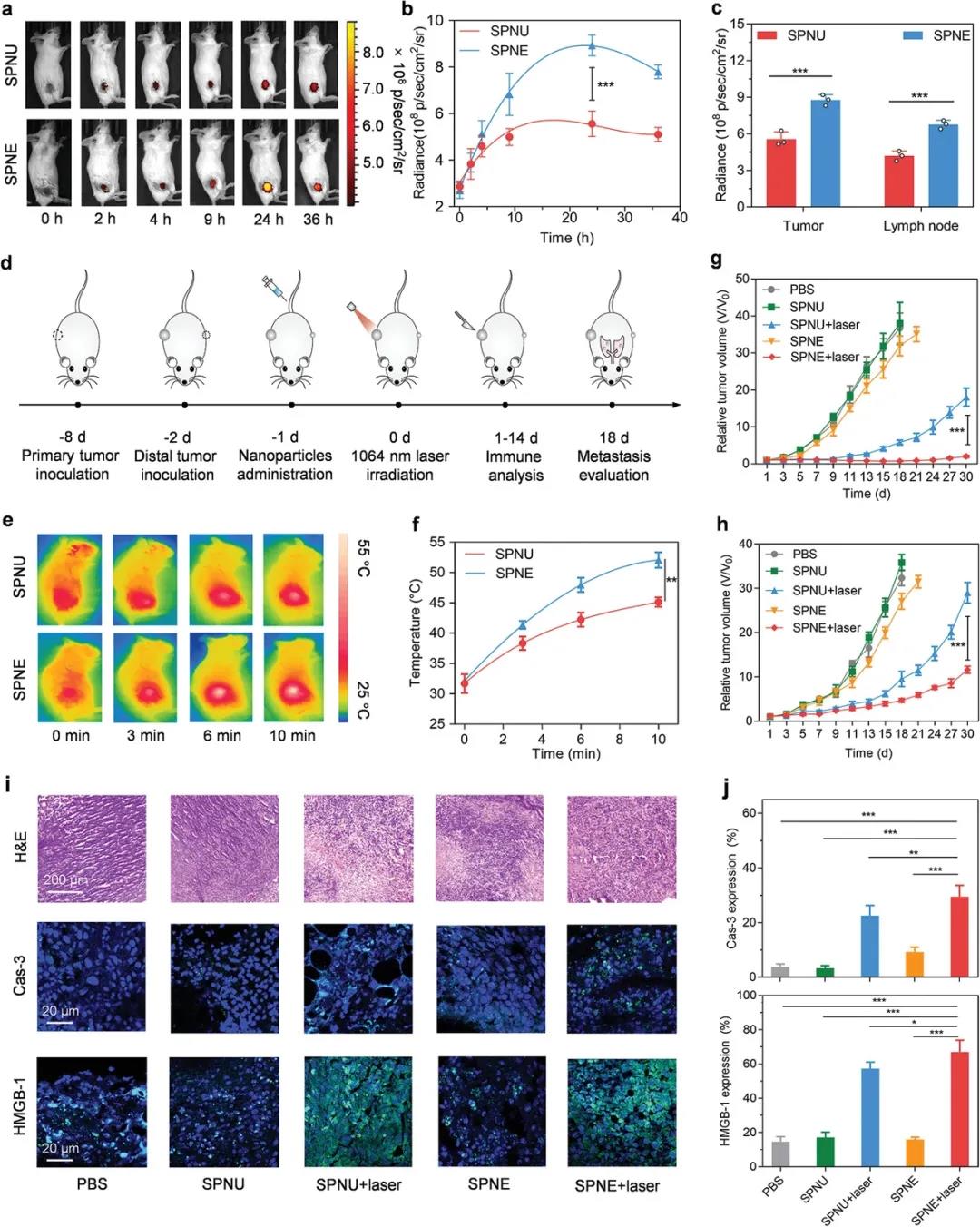 在穿透深层组织的NIR - II光照射下,SPNE能够根除肿瘤并诱导免疫原性细胞死亡,进一步诱导抗肿瘤T细胞免疫。这种协同光热免疫治疗作用最终抑制肿瘤生长,防止转移,获得免疫记忆。