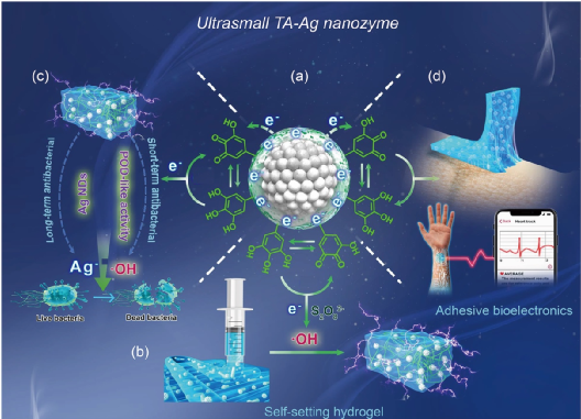 针对这些问题,近日,西南交通大学鲁雄教授和谢超鸣副教授团队设计开发了一种新型仿贻贝纳米酶。该仿贻贝纳米酶不仅具有天然酶的催化活性,而且还具有类似贻贝的粘附性能。利用仿贻贝纳米酶,他们构建了一种具有抗菌、导电、柔性和粘附性的多功能水凝胶,并用于生物电子。仿贻贝纳米酶由天然多酚单宁酸(TA)螯合银纳米颗粒(Ag NPs)构成。具有以下优点:(1)利用其高效稳定的过氧化物酶活性,仿贻贝纳米酶可在无外界刺激下,如UV光照和热引发,催化水水凝胶自成型;(2)仿贻贝纳米酶通过其过氧化物酶活性催化H2O2产生ROS,结合Ag本身的抗菌性,为水凝胶提供了催化抗菌性能。(3)基于TA与Ag NPs之间的电子转移,仿贻贝纳米酶提供了大量多酚基团给水凝胶,加强了其组织粘附性、机械性和导电性,使水凝胶可在无外部辅助固定下稳定检测人体生理信号。