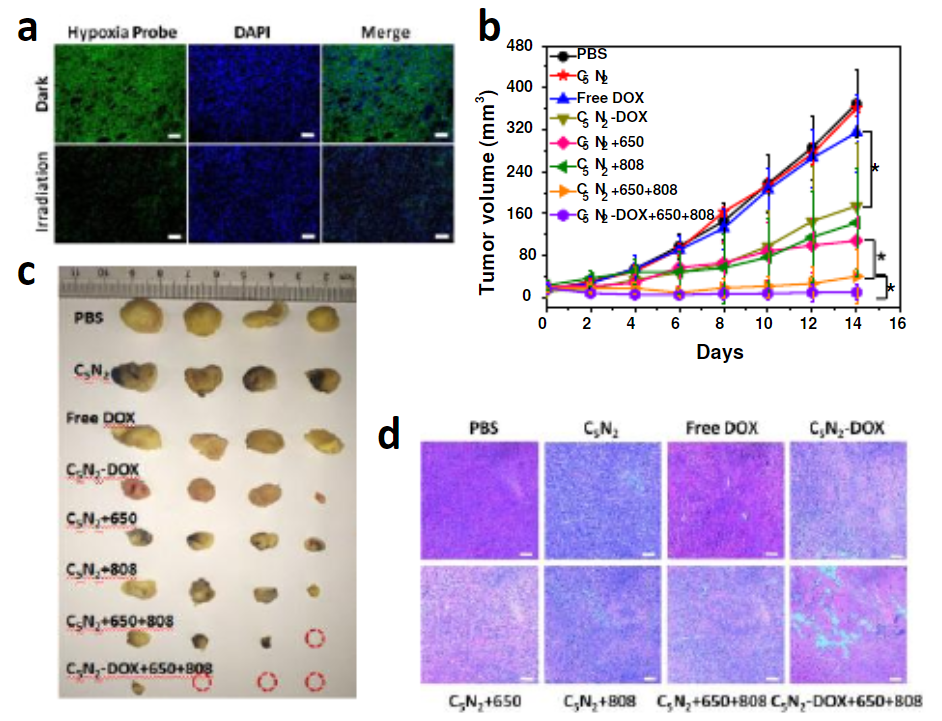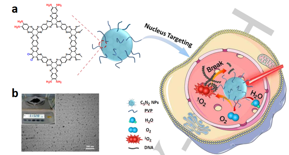 本文要点:(1)实验通过一步法制备了克级C5N2纳米颗粒(NPs)基有机半导体。在650 nm激光照射下,该半导体可裂解水以生成O2,并同时产生单态氧(1O2),表明在该有机半导体中可以同时作为生成O2的光催化剂和产生1O2的光敏剂(PS)。