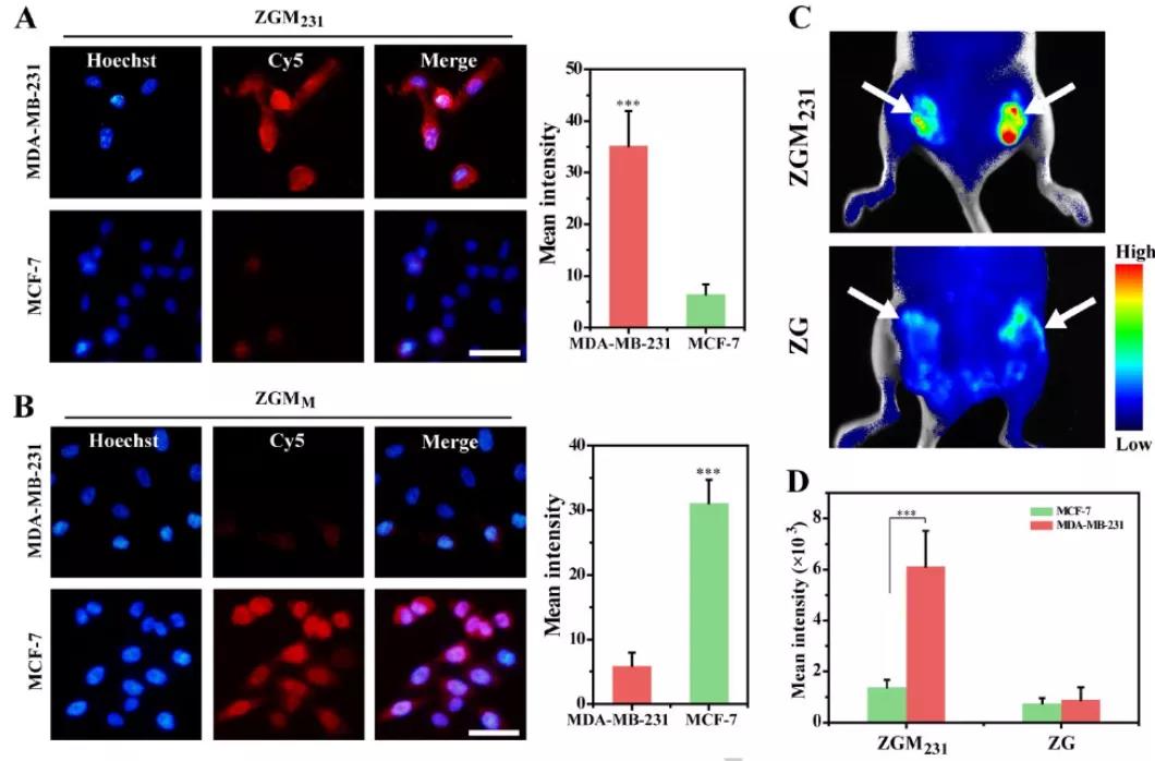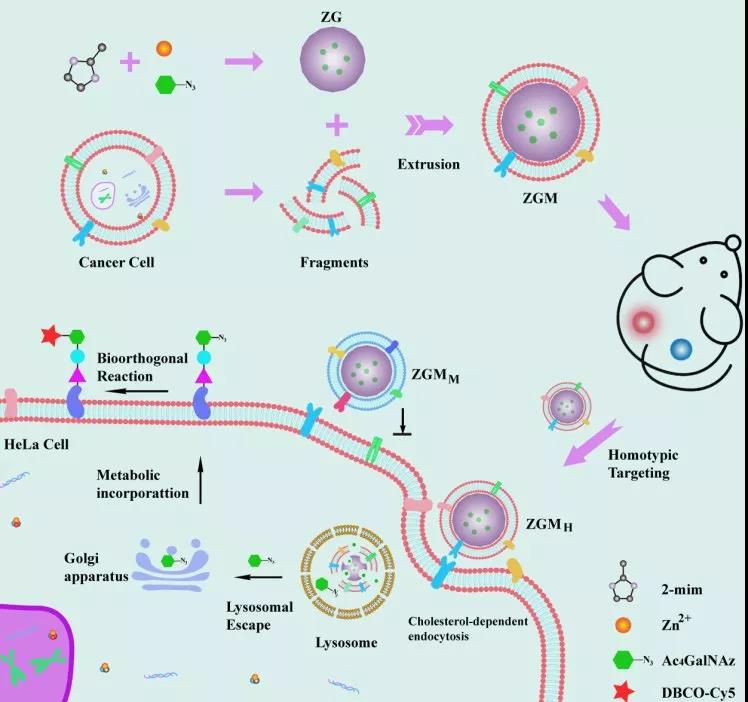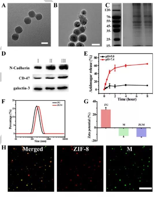 本文要点:(1)该仿生平台具有丰富的受体,不仅可以选择性地靶向同型细胞,还可以实现对不同乳腺癌亚型的选择性MGL。此外,具有内溶酶体逃逸性能的ZIF-8可使得叠氮糖从溶酶体中逃逸并加速其代谢整合。