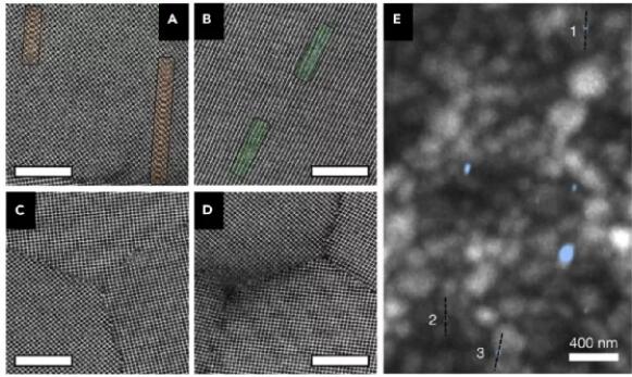 钙钛矿吸收层中纳米级性能、化学和结构的异质性可视化原子尺度缺陷通过利用扫描透射电子显微镜的低剂量、低角度环形暗场成像,人们已经获得了FAPbI3和MAPbI3薄膜的原子分辨率图像,这种原子水平的理解为卤化钙钛矿卓越性能的机理提供了新的见解。残留的前驱体PbI2和FAPbI3晶粒之间具有连贯,无缺陷,低应变的界面,这有助于解释为什么少量的PbI2可能不会损害电池性能。同时,钙钛矿中相对未被探索的结构缺陷、但常见的堆积缺陷和刃位错(图1A和1B),可能对性能有重要的影响。对FAPbI3/FAPbI3晶界的研究提供了更深入的了解:虽然大多数三点晶界是连续结晶的,但一些晶界明显包含非晶态材料和排列的点缺陷(图1C和1D)。对观察到的结构缺陷进行完整、连贯地理解需要更多的工作,重点是结合光物理信息和模拟的原子分辨率成像,以确定哪些缺陷与材料的稳定性和性能最相关。
