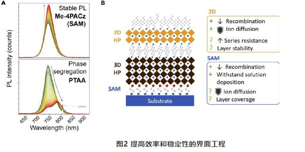 到目前为止,高效卤化物钙钛矿电池仅依靠钝化一个钙钛矿界面。SAM和2D卤化物钙钛矿的组合使用分别钝化底部和顶部界面,有可能使FF和J sc都接近其极限(图2B)。但是,要超越当前的最新技术水平,还需要对钝化层进行更好的控制,并且需要更好地理解钝化层进行电荷提取的机制。
