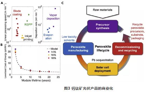 钙钛矿组件的使用寿命目前,钙钛矿领域的主要重点是效率。但是,图3 B中所示的技术经济分析表明,与模组寿命相比,将钙钛矿单结光伏组件的效率从14%-18%改变对LCOE的影响很小。稳定性将在未来的商业化努力中占据中心位置。因此,人们已经做出了重大努力,以超越热力学不稳定的MAPbI3,开发更稳定的卤化物钙钛矿成分。除了薄膜之外,还需要更多的努力来开发用于钙钛矿模组的包装材料,以及专门针对钙钛矿的加速降解测试协议。