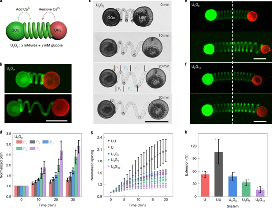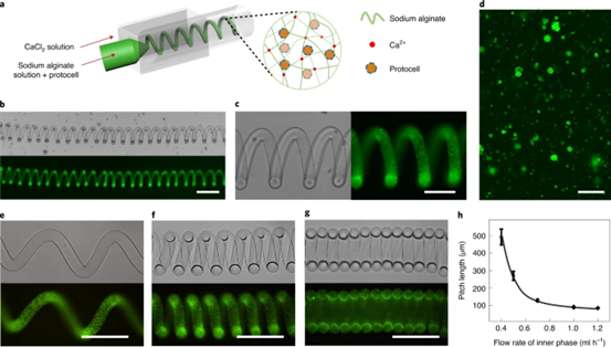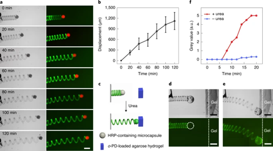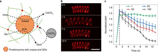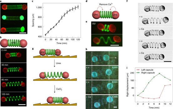 人工细胞样群落参与多种化学相互作用模式,但与当地环境的接触极少。最近,英国布里斯托大学Mei Li博士/Stephen Mann院士团队开发了一种交互式微系统,该系统基于将一群酶活性半透性蛋白体固定在螺旋水凝胶丝内,以实现信号诱导运动。