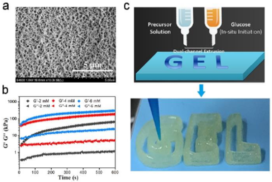 摘要可注射前体的原位凝胶化在组织再生领域是可取的,尤其是在不规则缺陷填充的情况下。当前快速凝胶化的驱动力包括热敏共聚物的相变、与组织成分的点击化学反应和金属配位效应。然而,快速形成坚韧的水凝胶仍然是一个挑战。受有氧代谢的启发,同济大学王启刚教授团队提出了一种由葡萄糖氧化酶和甘氨酸亚铁催化的组织液触发的级联酶聚合过程,用于丙烯酰化硫酸软骨素和丙烯酰胺的超快速凝胶化。