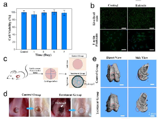 图4 (a) 在水凝胶提取物中培养的软骨细胞的细胞活力超过7天。(b)在 Dulbecco s Modified Eagle 培养基和水凝胶提取物中培养的活/死和 F-肌动蛋白鬼笔环肽染色的软骨细胞的荧光图像。(c) 使用水凝胶进行软骨修复的动物实验示意图。(d) 对照组和治疗组治疗前后髌骨照片。(e) 对照组和治疗组髌骨修复后的显微CT图像。
