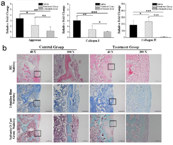 图5 (a) 蛋白聚糖、胶原蛋白 I 和胶原蛋白 II 的基因表达。(b) HE染色、甲苯胺蓝染色和番红O染色观察的组织切片。
