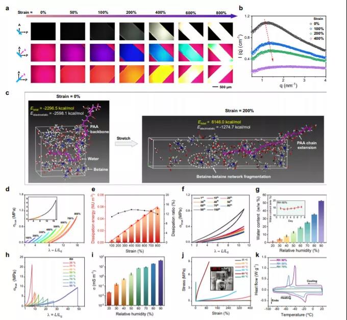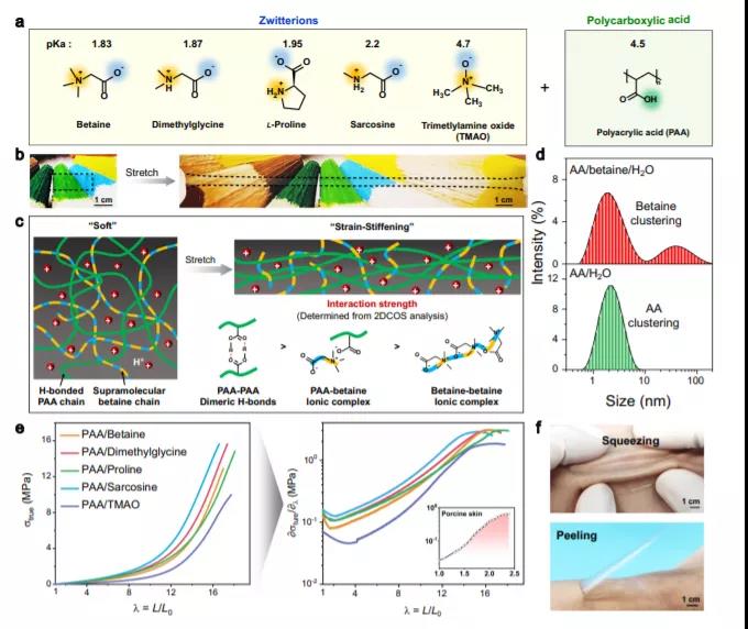 与依赖大量溶剂使用的水凝胶和离子凝胶不同,目前的离子弹性体只存在平衡含水量。这一特性使得分子间二聚体氢键足够强,可以在常温下交联多羧酸链,同时当浸泡在高湿度中时会变得动态,从而实现完全的自愈合,此外,由弱配合两性离子组成的两性网络有助于离子弹性体的初始柔性,随后在拉伸过程中会碎裂,从而形成一个非常坚硬的氢键合的聚羧酸网络。