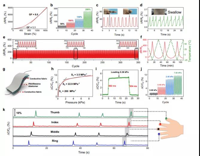作为皮肤类传感器,离子弹性体对应变和温度变化表现出及时的响应,并可进一步与弹性导电织物集成,作为离子智能传感器感知压力变化,显示出其在可穿戴电子产品中的巨大应用潜力。