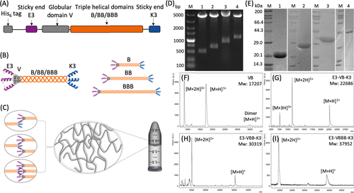 图 1. 蛋白质的设计策略和验证。测试了三种设计:E3-VB-K3、E3-VBB-K3 和 E3-VBBB-K3。蛋白质的 (A) 序列和 (B) 二级结构的示意图。(C) 提出的分子间关联和自组装机制。凝胶电泳表征 (D) 用 NcoI 和 BamHI 酶消化重组质粒后核苷酸片段的长度和 (E) 蛋白质的分子量。(F-I) 基质辅助激光解吸电离飞行时间 (MALDI-TOF) 质谱法表征蛋白质的分子量。
