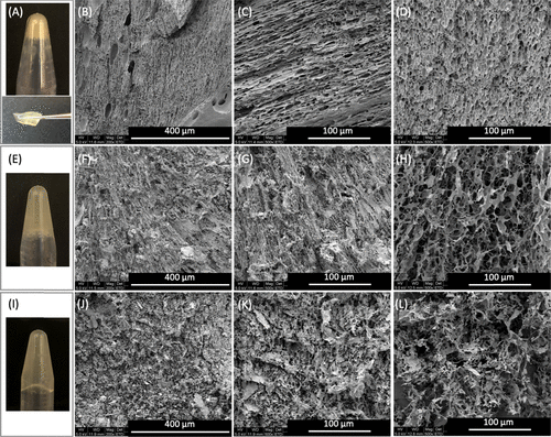 图 2. 凝胶结构。(A-D) E3-VB-K3 的凝胶化通过倒置小瓶和镊子操作来测试。冻干后,凝胶的微观结构被切成 (B, C) 纵向和 (D) 横截面,并用扫描电子显微镜 (SEM) 观察。(E-H) E3-VBB-K3 的小瓶倒置测试和 SEM,具有 (F, G) 纵向和 (H) 横截面,以及 (I-L) E3-VBBB-K3,具有 (J, K) 纵向和 (L) 横向横截面。由于 E3-VBB-K3 和 E3-VBBB-K3 凝胶的硬度低,它们不能用镊子处理。
