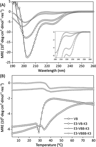图 3. 蛋白质结构和稳定性。(A) CD 波长扫描和 (B) VB、E3-VB-K3、E3-VBB-K3 和 E3-VBBB-K3 在 10 mM 磷酸盐缓冲液 (pH 7.4) 中 1 mg/mL 的热变性曲线。