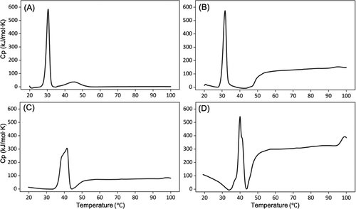 图 4. 10 mM 中浓度为 10 mg/mL 的设计胶原蛋白 (A) VB、(B) E3-VB-K3、(C) E3-VBB-K3 和 (D) E3-VBBB-K3 的差示扫描量热法 磷酸盐缓冲液(pH 7.4)。