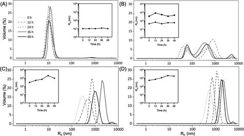 图 5. 粒度分布。设计的胶原蛋白 (A) VB、(B) E3-VB-K3、(C) E3-VBB-K3 和 (D) E3-VBBB-的流体动力学半径(Rh)分布的动态光散射 (DLS) 测量 K3 超过 48 小时。将样品在 10 mM 磷酸盐缓冲液中保持在 4 °C,浓度约为 1 mg/mL(pH 7.4)。每个子图的插图显示主要 Rh 峰(> 5% 体积强度)随时间的变化。在所有子图中,不同时间的Rh分布曲线如右图所示。
