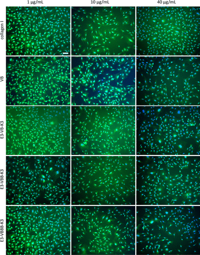 图 7. 细胞在涂有设计胶原蛋白的板上铺展。将 NIH/3T3 小鼠成纤维细胞接种并铺展在涂有天然 I 型胶原蛋白(阳性对照)、VB、E3-VB-K3、E3-VBB-K3 和 E3-VBBB-K3 的组织培养板上,浓度为 1 、10 和 40 μg/mL,持续 24 小时。蛋白质名称和浓度分别标记在图的左侧和顶部。细胞用 CFDA SE 和 Hoechst 染色,并用荧光显微镜观察。比例尺代表所有图像中的 100 μm。