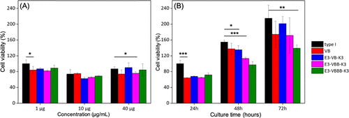 图 8. 由不同 (A) 浓度和 (B) 培养时间的设计蛋白质组成的底物上的相对细胞活力。样品名称标在右侧。测试天然 I 型胶原蛋白(黑色)作为阳性对照。