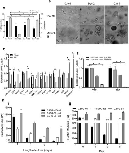 图4 与基于 3D PEG 的水凝胶相比,3D PGmatrix 水凝胶中的 hiPSC 显示出优异的特性。A) ASC-hiPSCs 在含有 mTESR1 (0.5 PG-mT) 的 3D PGmatrix (0.5%) 中比在含有 E8 培养基 (Mebiol-E8) 的 3D Mebiol 凝胶中生长得更好。
