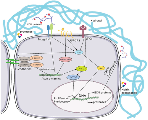 细胞通过分泌蛋白酶作为基质降解酶和 ECM 蛋白来积极改变周围的 3D 微环境。这些修饰通过细胞间接触(E-钙粘蛋白)和旁分泌信号分子促进细胞迁移和信号传导。除了可溶性因子信号外,来自细胞-基质或细胞-细胞粘附的物理(机械强度)线索影响肌动蛋白-肌球蛋白细胞骨架并通过 Hippo 途径发送信号,最终影响机械敏感 YAP/TAZ 基因的表达,以调节和维持 hiPSC 的增殖和多能性,以实现 hiPSC 的长期维持。GPCRs——G蛋白偶联受体和RTKs——受体酪氨酸激酶。