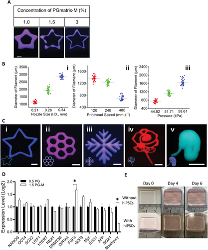 图5 PGmatrix-M 作为生物墨水的可印刷性和 hiPSCs 性能。A) PGmatrix-M 在不同浓度下的打印分辨率。B) i) 喷嘴尺寸、ii) 打印头移动速度和 iii) 打印压力对 PGmatrix-M bioink 可打印性的影响。C)不同图案的生物打印 PGmatrix-M 结构 (3%)。比例尺。5 毫米。D)在 1.5% PGmatrix-M (1.5 PG-M) 中培养的 ASC-hiPSC 与在 0.5% PGmatrix (0.5 PG) 中培养的那些相比,在多能性相关基因中没有表现出主要的表达模式差异。E) PGmatrix-M 构建体在有或没有 hiPSCs 的情况下保持稳定至少 6 天(在第 6 天之前破坏构建体以收集细胞以进行进一步分析)。