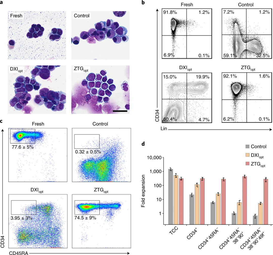 研究人员利用ZTG opt与优化的Delta1 ext-IgG(DXI)以及作为未修饰的TCPS培养瓶三种方式分别培养HSPC,发现ZTG opt培养后,该HSPC的原始细胞同质性得以保留,而DXI 与TCPS培养瓶的培养方式均会导致细胞出现颗粒状胞质和不规则的核等异质性表型。如图2所示,在整个培养期间,ZTG opt种群保持CD34高表达,ZTG opt扩增后的细胞中CD34 +占93.7%±2%,表明ZTG水凝胶3D培养方式可抑制HSPC分化。