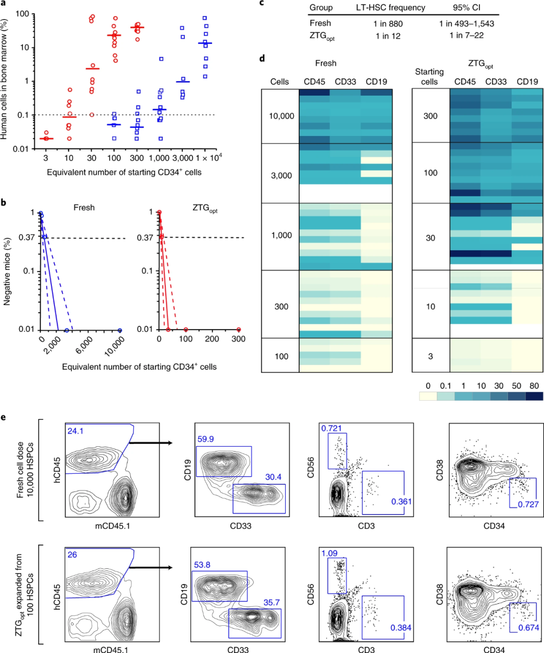 ZTG opt方式培养的脐带血来源的CD34 + HSPC在体内可保持扩增能力已得到证明,研究人员又利用有限稀释分析(LDA)来检测中长期再生造血干细胞(LT-HSC)的扩增频率的情况。实验结果如图3所示,在移植后24–30周后,ZTG opt方式培养的LT-HSC的扩增频率远高于其他培养方式。有限稀释分析和二次移植实验均证明ZTG培养扩增了具有长期造血功能的LT-HSC细胞。