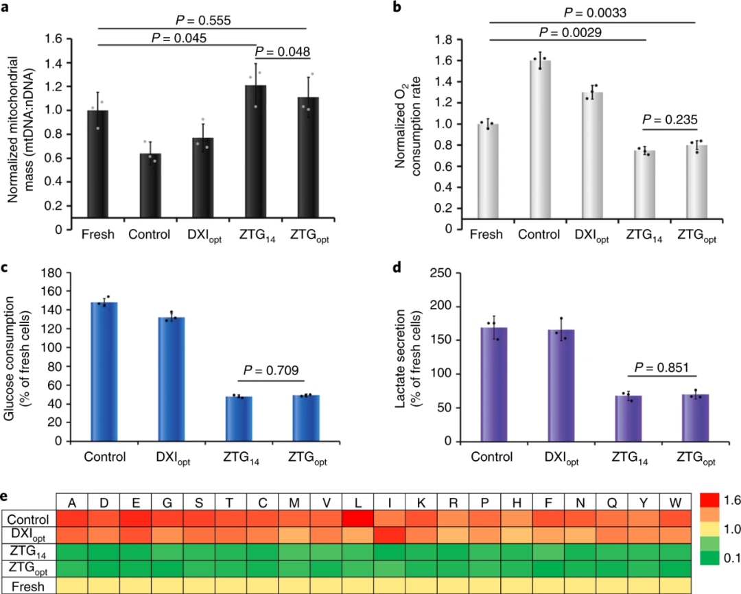此外,研究人员通过分析ZTG14,ZTGopt和其他扩增方式培养的细胞内线粒体质量和代谢活性,发现ZTG14和ZTGopt细胞中线粒体质量略有增加,与DXIopt和对照组的显着下降形成鲜明对比,另外葡萄糖消耗和乳酸分泌量也远低于DXIopt和对照组。实验结果如图5所示,表明ZTG培养中O2相关的代谢受抑制,再次证明 ZTG水凝胶3D培养方式保持了原始的HSPC特性。