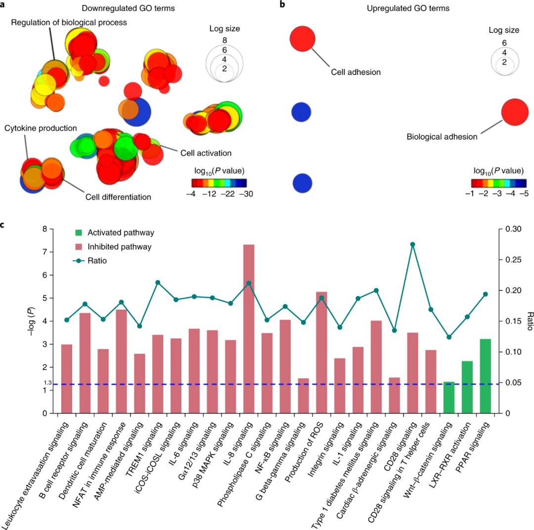 为了更深入地了解ZTG水凝胶内的CD34 + HSPC的活性,研究人员利用mRNA深度测序(RNA-seq)进行了基因表达谱分析。如图6所示,与新鲜分离的原代HSPC相比,超过10,000个基因的表达在ZTG培养的HSPC中没有显着变化。对比其他培养方式,ZTG培养组中与细胞分化,细胞活化和细胞因子产生相关的基因显著下调,再次表明ZTG培养方式可减缓细胞代谢过程。
