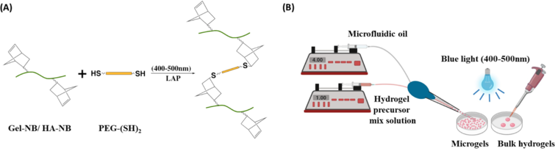 图1(A)巯基-降冰片烯点击反应示意图;(B)块状水凝胶和微凝胶制备示意图