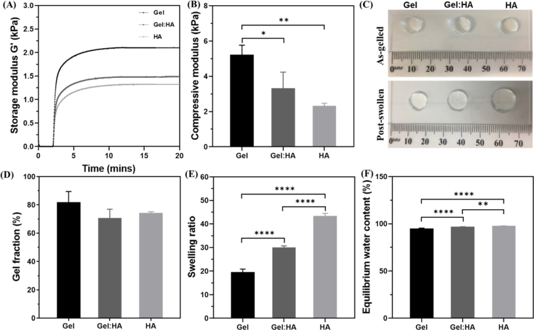 首先,作者设计了三种不同的含有硫醇功能化PEG (PEG-(SH)2)的水凝胶,并与降冰片功能化明胶(Gel-NB)或降冰片功能化透明质酸(HA-NB)或Gel-NB和HA-NB的混合凝胶混合使用。水凝胶的光交联动力学通过原位光流变学进行监测,结果显示,无论水凝胶组成如何,光暴露的几秒钟内就能迅速形成凝胶。从压缩测试中得到的应力-应变曲线可知,Gel、Gel:HA和HA水凝胶的压缩模量分别为5.2、3.3和2.3 kPa,与存储模量的变化趋势相同。这些数据表明,水凝胶的硬度呈现出Gel>Gel:HA> HA的趋势。由于高含水量的水凝胶往往比含水量少的水凝胶更软,HA和明胶亲水性的差异也可能导致由它们形成的水凝胶的力学性能的差异(图2)。