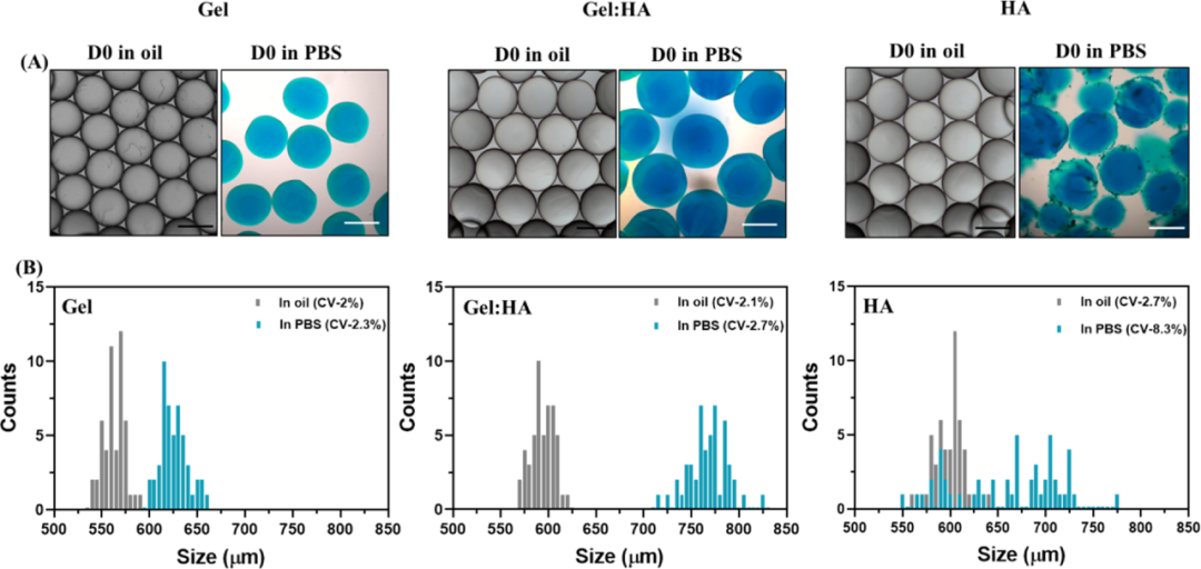 接下来,作者使用基于移液管的微流体技术合成Gel、Gel:HA和HA微凝胶。对微凝胶的大小和分布进行了表征。Gel:HA微凝胶与在块状水凝胶中观察到的溶胀一致,都归因于HA的高亲水性(图3)。