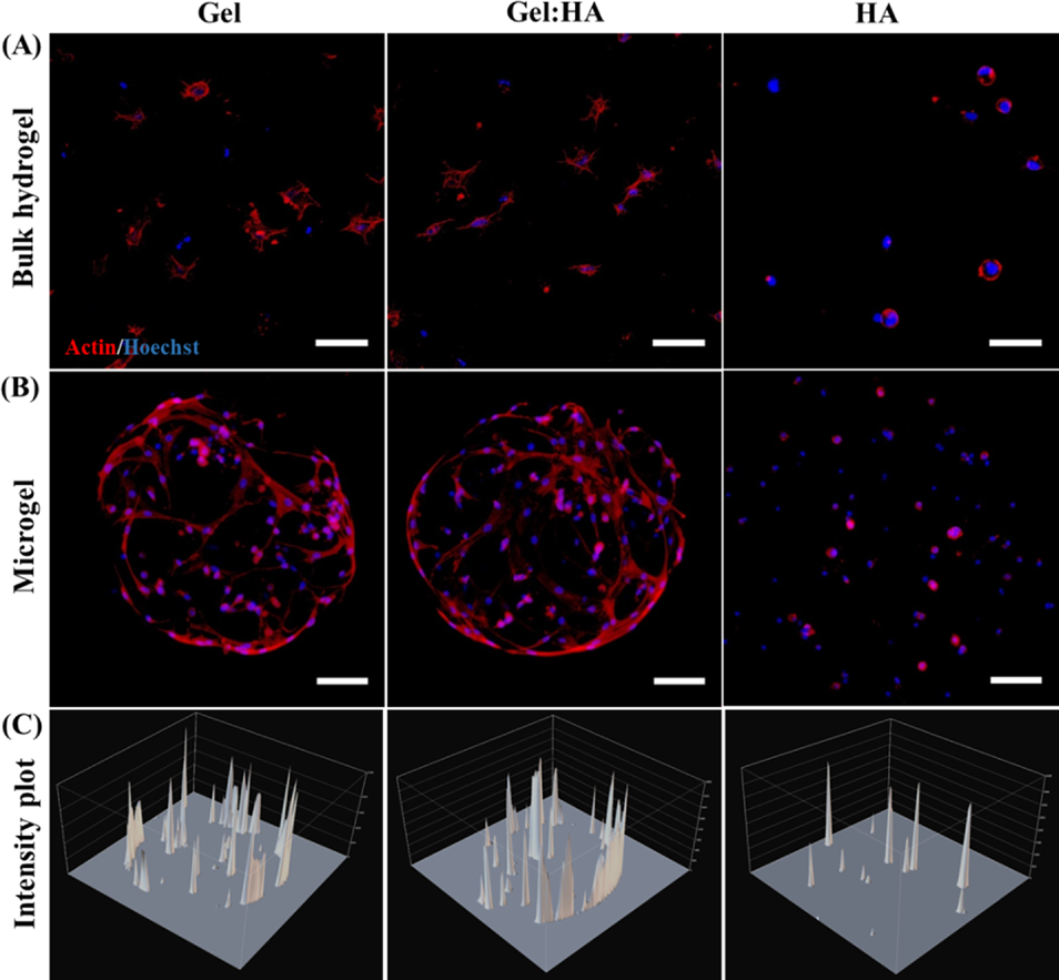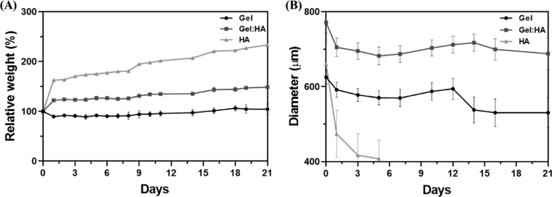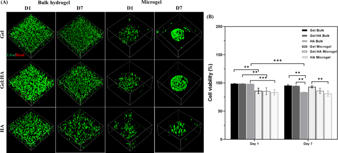 为了了解水凝胶对细胞培养的稳定性和适宜性,作者测定了三种水凝胶制剂在大体积和微凝胶状态下的体外降解率。与块状水凝胶相比,在DPBS中Gel:HA和HA水凝胶的质量显著增加。所有体积水凝胶的凝胶质量在10天内保持相对稳定。10天后,观察到所有水凝胶成分的质量逐渐增加,HA 增加的比例更高。同时微凝胶的降解性能与整体水凝胶有显著差异。微凝胶与块状水凝胶的比表面积的增加增加了传质导致块状水凝胶更快的降解,这种效应对于高亲水性的HA微凝胶更为明显,可能是由于较高的溶胀程度(图4)。
