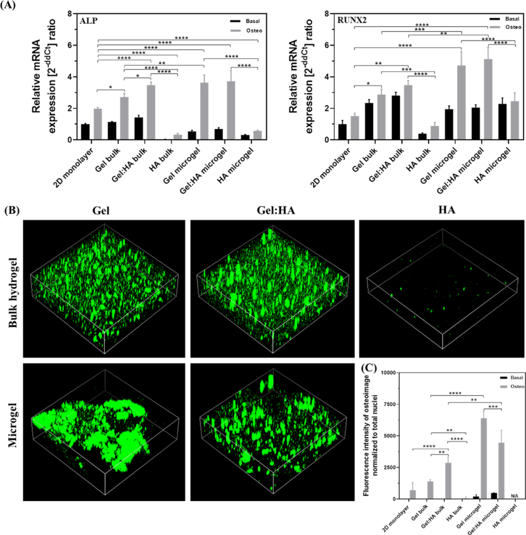 为了确定水凝胶组成和几何形状对间充质干细胞分化的影响,所有组成的体积水凝胶和微凝胶均在基础培养基和骨诱导培养基中培养7天。与基础培养相比,骨诱导培养中ALP和RUNX2基因表达明显上调,表明hBMSC成功分化为成骨细胞系。此外,Gel和Gel:HA内的hBMSC成骨诱导培养中ALP和RUNX2的表达明显高于2D单层细胞培养。这强调了3D平台相对于2D平台的优势。相反,HA水凝胶不支持成骨。同样的,与块状凝胶相比在微凝胶中ALP表达也明显增高(图7)。