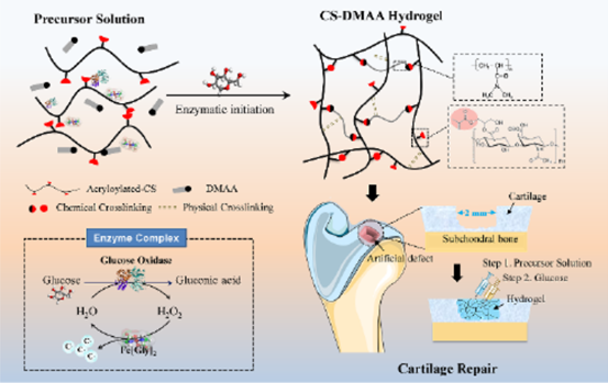 The efficient production of carbon free radicals and macromolecules helps to accelerate the polymerization automatically, which can be used to increase the soft tissue in bone defects. Copolymer hydrogel demonstrated the ability of cartilage regeneration. As the first example of in situ polymerization using artificial enzyme complexes, this work provides a bionic method for designing intensity adjustable hydrogels for biological implants and biological printing applications. The related papers were published in "Angewandte Chemie International Edition" under the title of tissue fluid triggered enzyme polymerization for ultrafast gelation and cartilage repair.