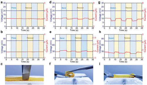 Fig. 3 the output voltage and current of the organic hydrogel thermal cell during the deformation process.