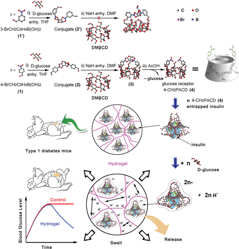 Schematic 1 is based on 2,6-o-dimethyl- β- CD (DM β CD) D-glucose receptor. i) Synthesis of D-glucose bridged ligands 2 and 2. 2) in DM β Nucleophilic substitution on CD. III) AcOH catalyzed hydrolysis of borate ester bonds and the mechanism of D- glucose responsive hydrogels swelling and insulin release.