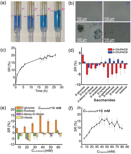 Fig. 2 response of hydrogel. A) a hydrogel with no CD derivative in the PBS solution (1#) and glucose solution (40 mm) (2#), and a picture of the gel -4PACD-10 (PBS) balanced in PBS solution (3#) and glucose solution (40 mm). B) micrographs of hydrogels, 4-CH2PACD doped into hydrogels, and aggregated as a glucose receptor with a diameter of about 100. μ M particles (3#), and when the hydrogel is immersed in glucose solution (4#), the particles decompose. C) the swelling rate of gel -4PACD-10 in the glucose solution (40 mm) along the equilibration time (SR). d) SR of gel-4pacd - in monosaccharide solution. e) SR of gel-4pacd-10 and gel-3pacd-10 in various sugar solutions. F) the SR of the gel 4PACD-10 is balanced in various concentrations of glucose solution.